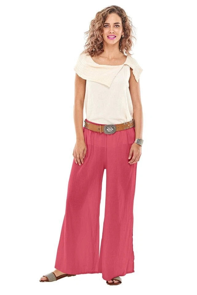 A popular, wide leg cotton gauze pant with a long side slit hemline that can be tied to change looks.