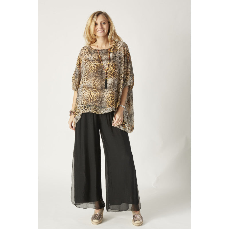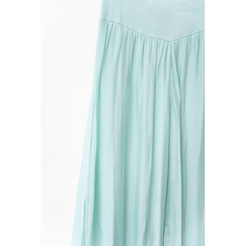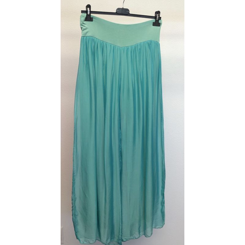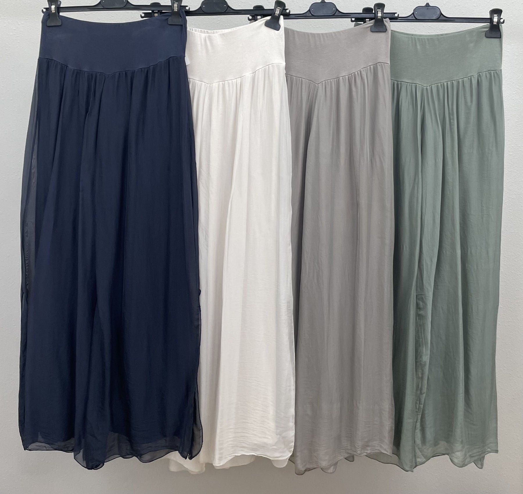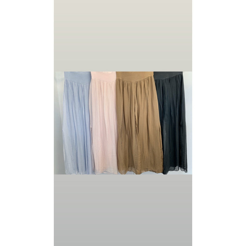 A dressy, flowing silk pant that is lined with a sexy slit on sides. The jersey waistband makes this a lovely fit!