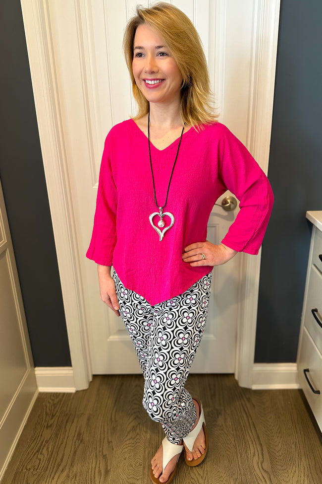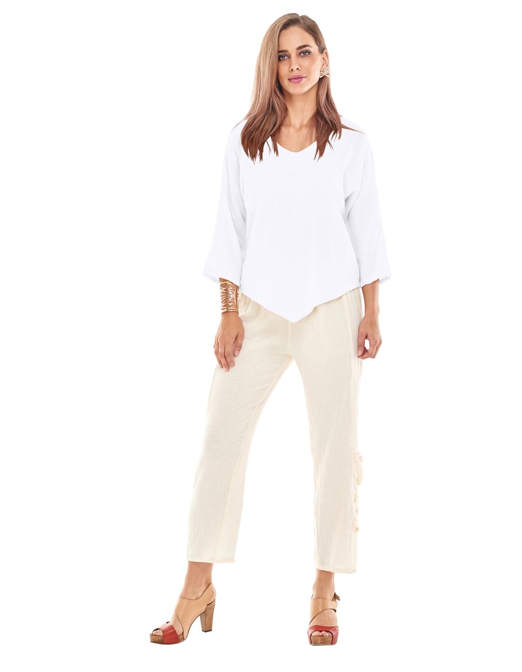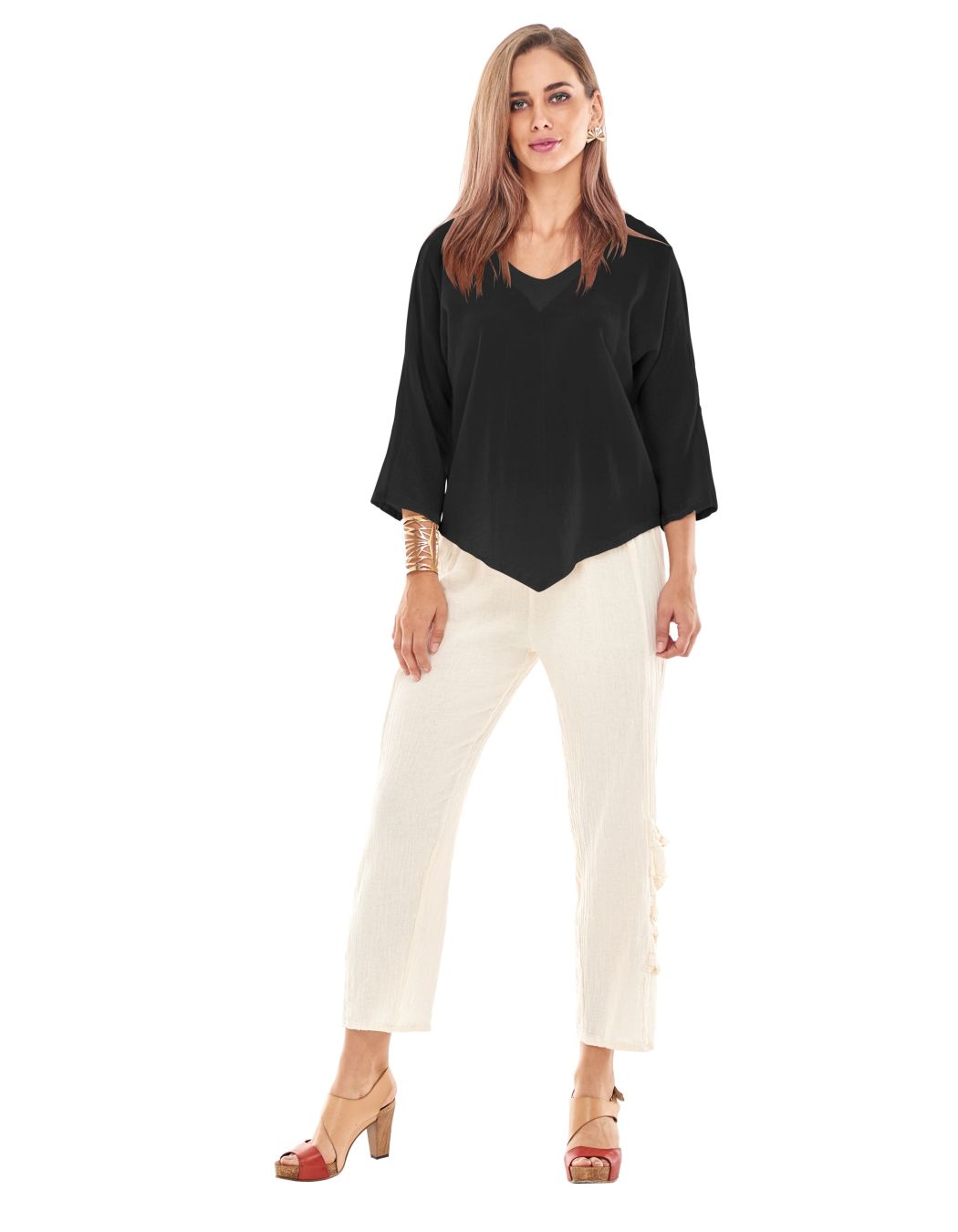 A cotton gauze V-neck top with delicate point detail at the bottom. A staple piece for your wardrobe!