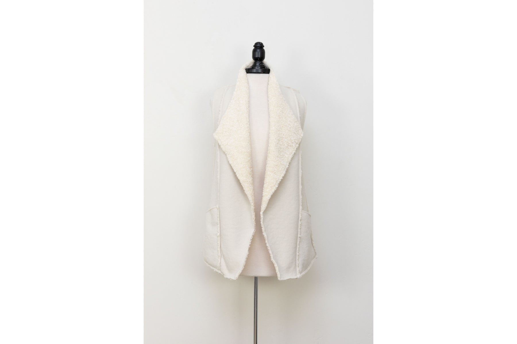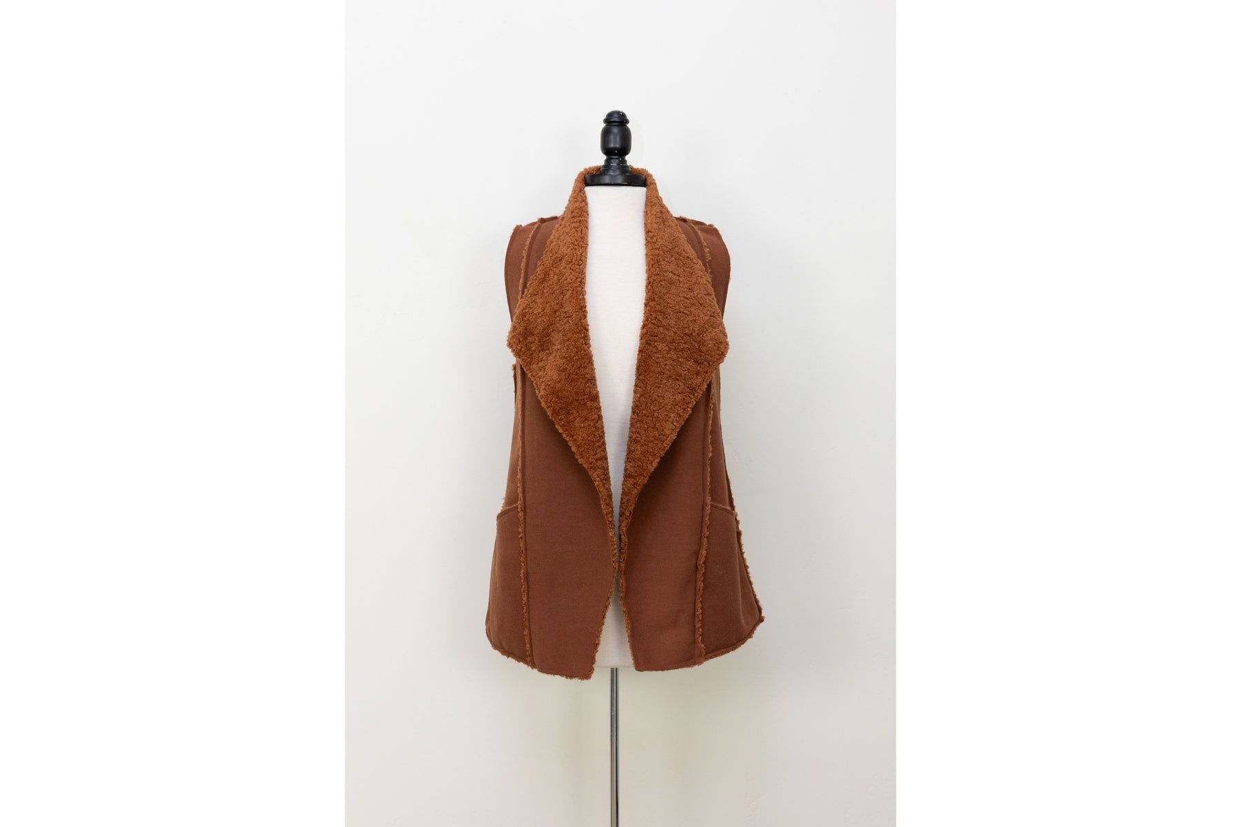 This reversible vest is your new favorite layering piece—flip between cozy faux fur sherpa and sleek suede depending on your mood. Thoughtfully designed with exposed seams for character, functional front pockets, and an open front silhouette that works over everything. Crafted from 100% polyester and made right here in the USA, it's ridiculously soft and surprisingly easy to care for with machine washing. Pure comfort meets versatile style.