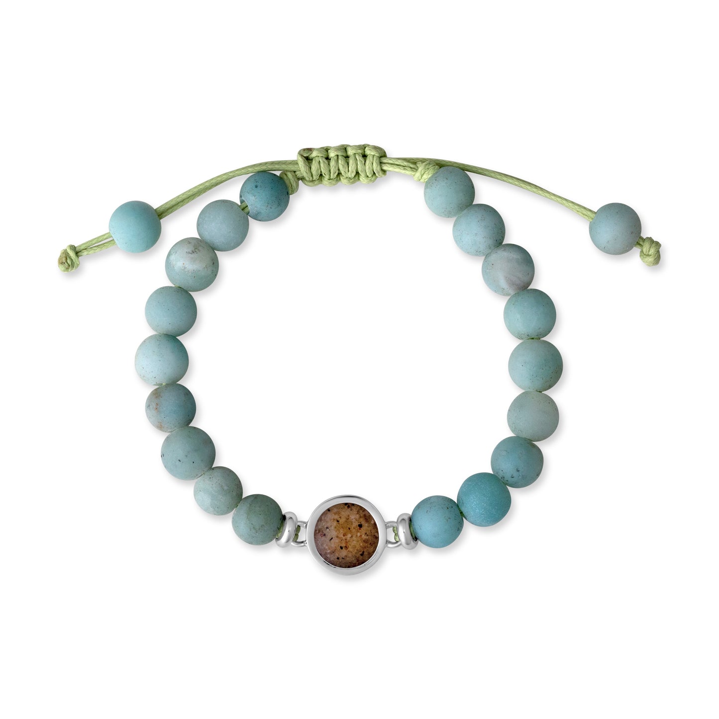 Crafted with genuine Amazonite Beads and an adjustable corded band, this bracelet features a round setting to hold your chosen sand or earth element, creating a unique reminder of a cherished memory or a future adventure.
