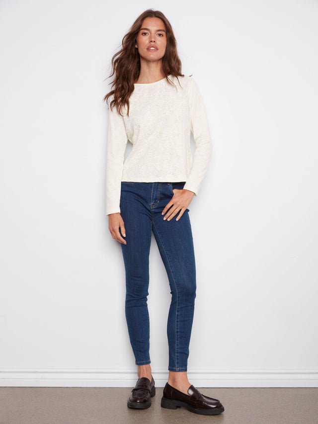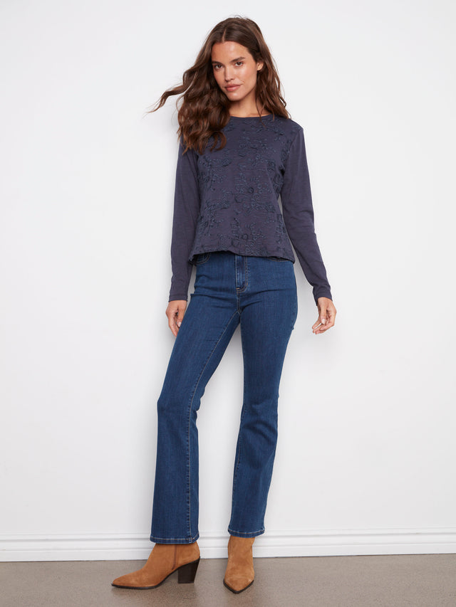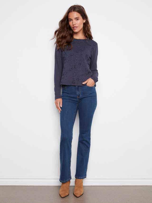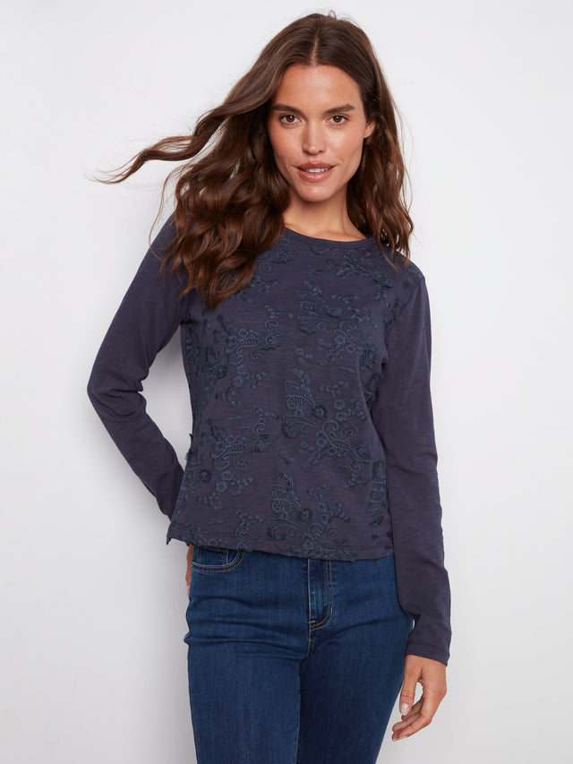 Embrace timeless elegance and unmatched comfort with our exquisite embroidered crew neck jersey top in moonlight blue. Made from 100% cotton, this fall essential combines refined sophistication with relaxed charm. Perfect for both polished office looks and casual outings, it adds an effortless touch of style to any outfit. The luxurious cotton guarantees comfort throughout the day, and its breathable quality makes it adaptable for year-round wear.