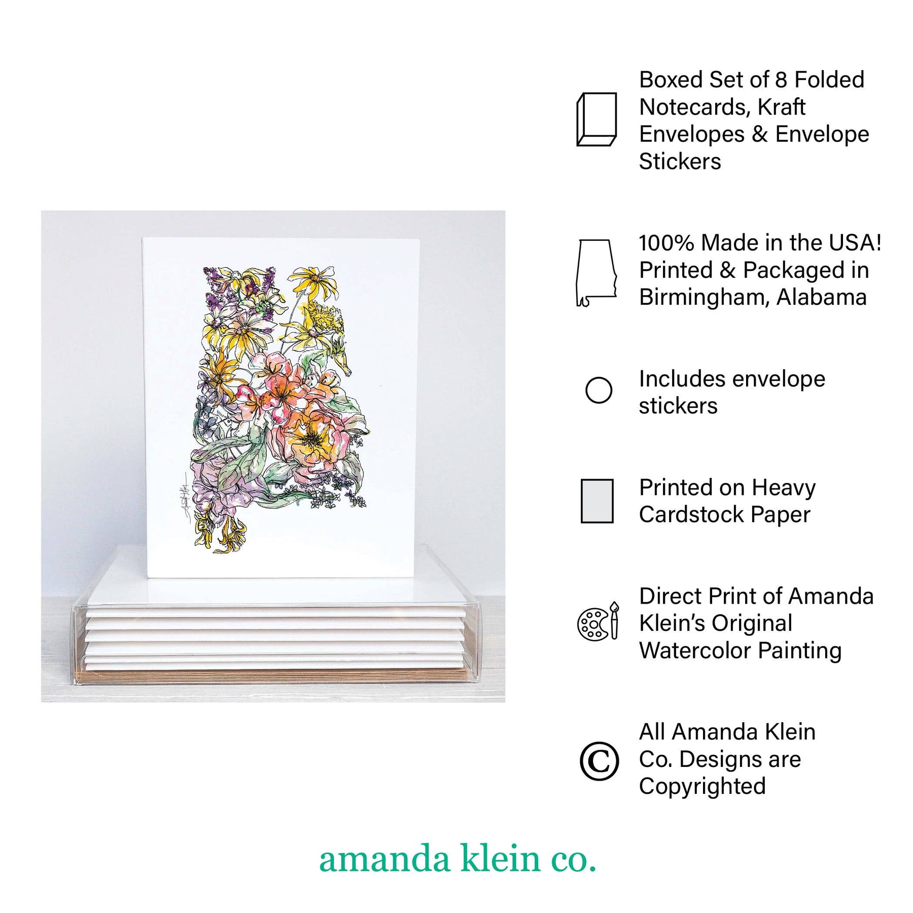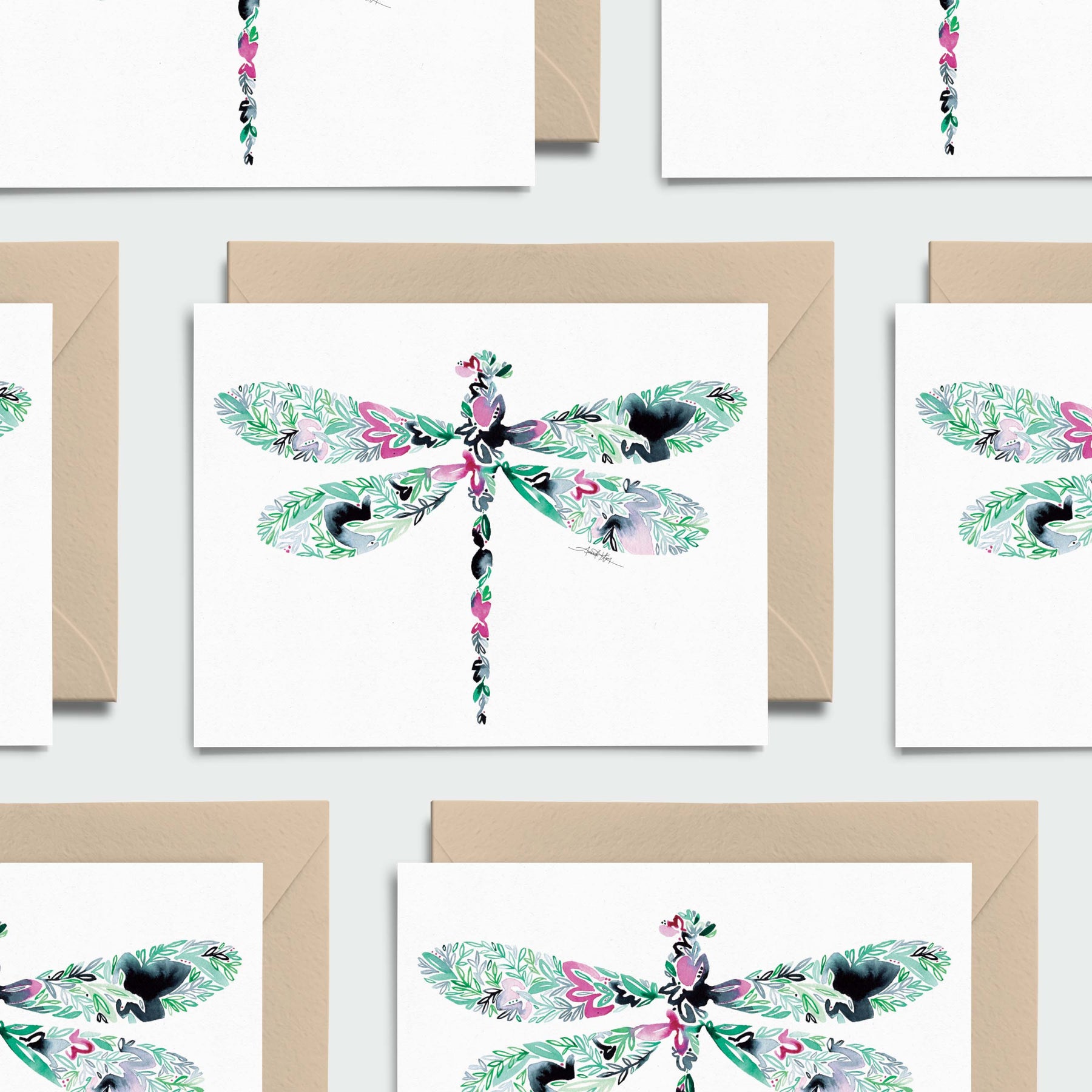 One of our best sellers! Our dragonfly note card box set features 8 blank notecards, kraft envelopes and envelope stickers. The original dragonfly piece was created by hand in Amanda Klein’s signature floral style using liquid watercolor and acrylic ink. We also offer a frameable companion print option. ➔ Each set includes: 8 blank note cards, 8 kraft envelopes and 8 custom envelope closure stickers secured neatly in an easily displayed clear stationery box. ➔ All note cards are small batch printed on heavy cotton paper and are 5 ½” x 4 ¼”. The back of each note card is equally as beautiful as the front and features a close up look at the Amanda Klein painted design from the front. ➔ Kraft envelopes are recycled, handcrafted and are 5 ¾” x 4 ⅜” (A2 size) ➔ Envelope closure stickers are custom to each note card print and are 2” round. ➔ 100% made in America // Woman owned + operated ➔