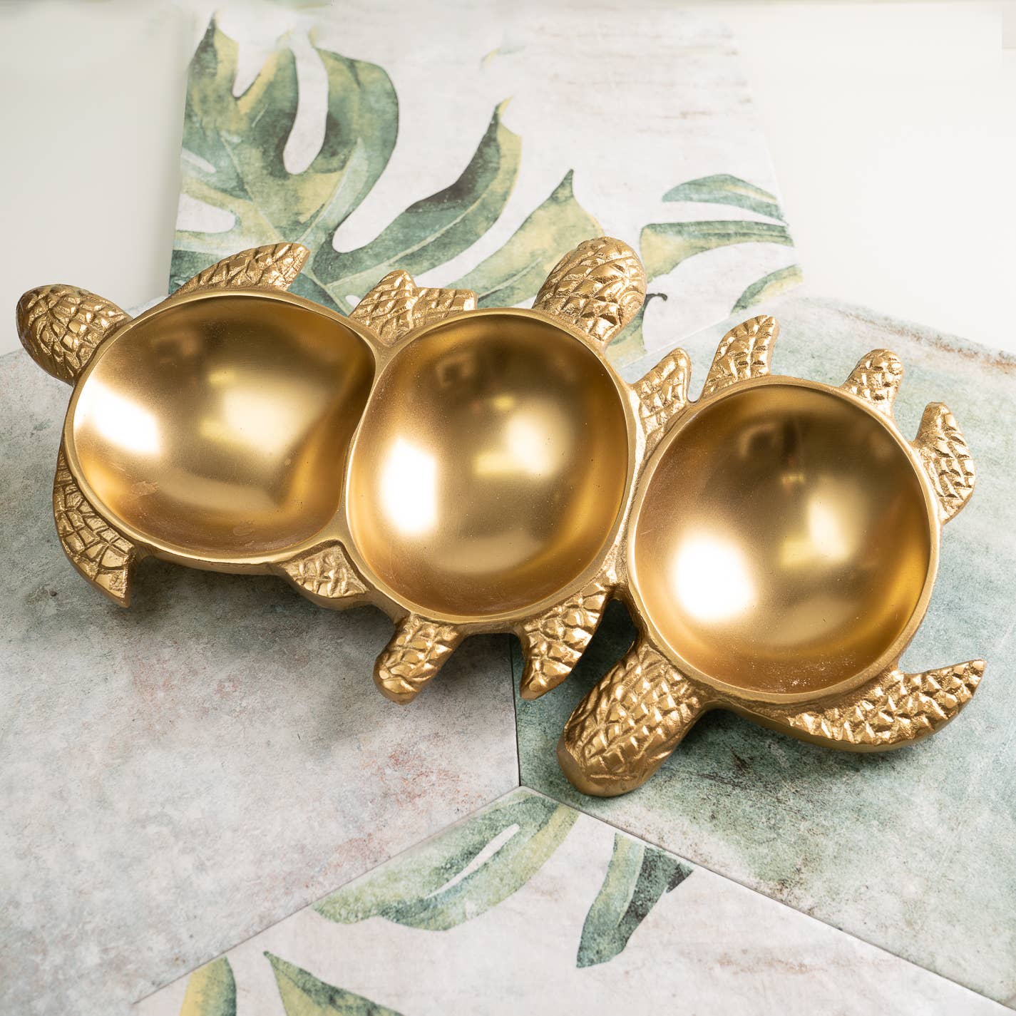 The Gold Aluminum 3-Section Sea Turtle Tray is a stunning addition to any home decor. Crafted from high-quality aluminum, this tray features a unique design inspired by the graceful sea turtle. With three sections, it is perfect for serving a variety of snacks, appetizers, or even organizing small items. The gold finish adds a touch of elegance and sophistication to any table setting. Whether you are hosting a dinner party or simply want to add a touch of style to your home, this tray is a must-have. It is not only functional but also a beautiful piece of serve ware that showcases your love for nature and fauna.