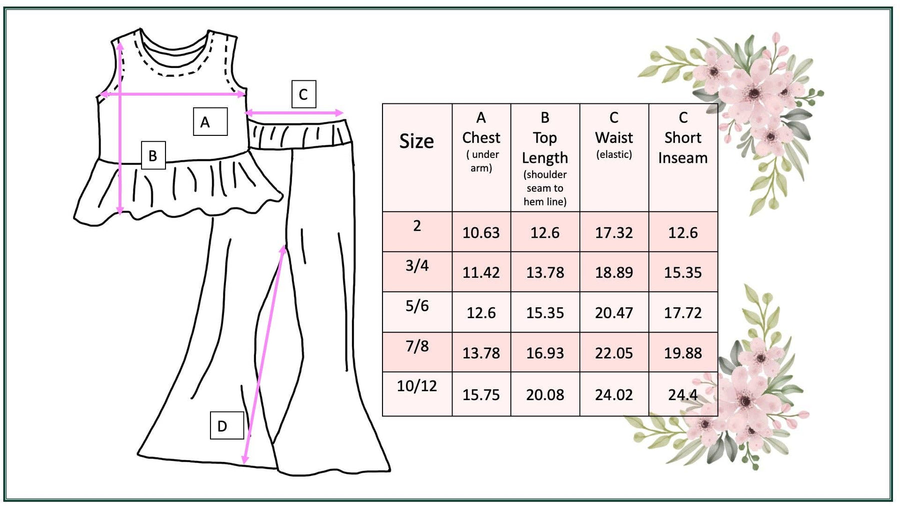 This adorable set features a playful dusty blue, pink, and white surfboard print on a sleeveless ruffle top, complete with matching bell bottom flare pants. Perfect for a day at the beach or summer fun, this set will have you looking and feeling cool!