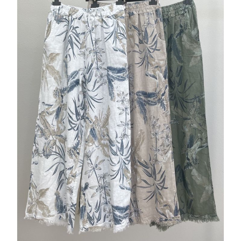 Our favorite tropical print in a fresh combination of white, navy and taupe, and olive, navy and taupe. Perfect with any of our linen tops or just a great tshirt!
