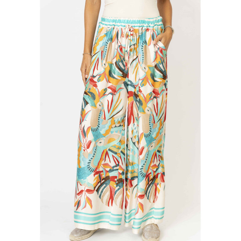 Look Mode Toucan Printed Pant in Aqua Color. Drawstring waist.  Fluid Wide Leg.