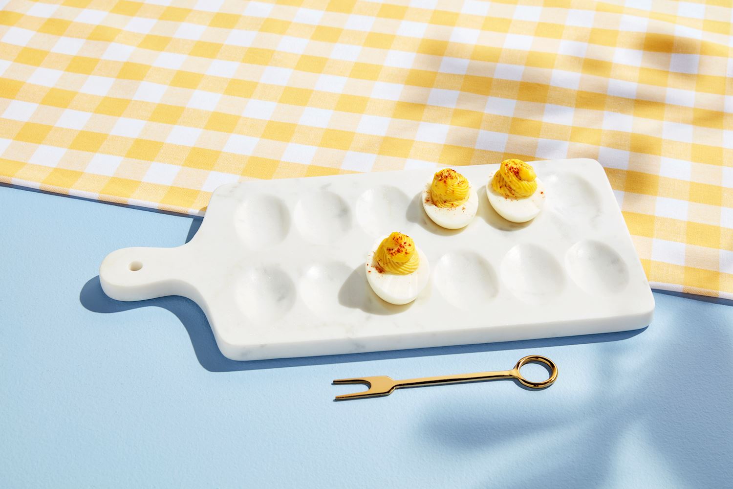 2-piece set. Marble deviled egg paddle board. Comes with brass finished stainless steel fork.