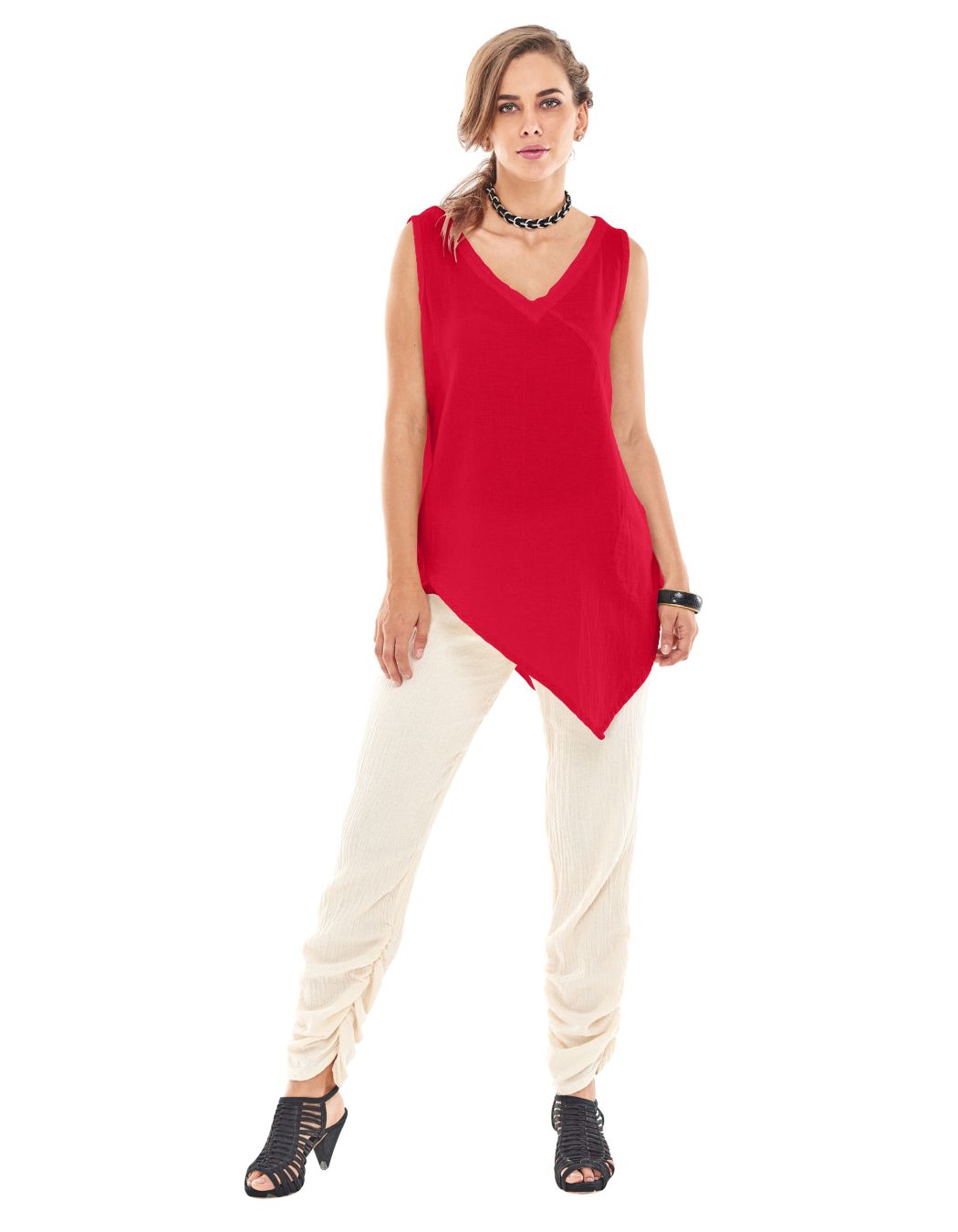 A Breeze through summer in the Oh My Gauze Allie Top! This playful cotton gauze creation features a flattering V-neck and sleeveless design that keeps you cool while turning heads. The unique asymmetrical side point adds a dash of personality, while the discreet pocket holds your little secrets. Perfect for beach days or casual outings when you want to look effortlessly chic!