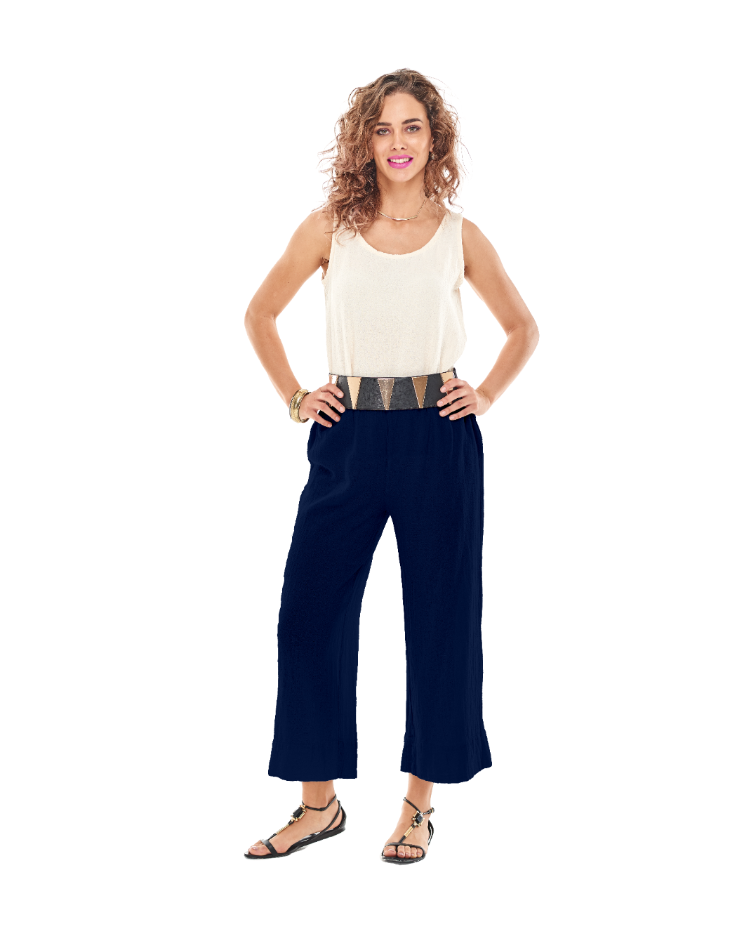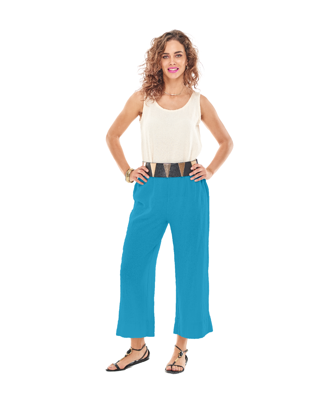 A popular, wide leg, cropped cotton gauze pant that has a short side split hemline.