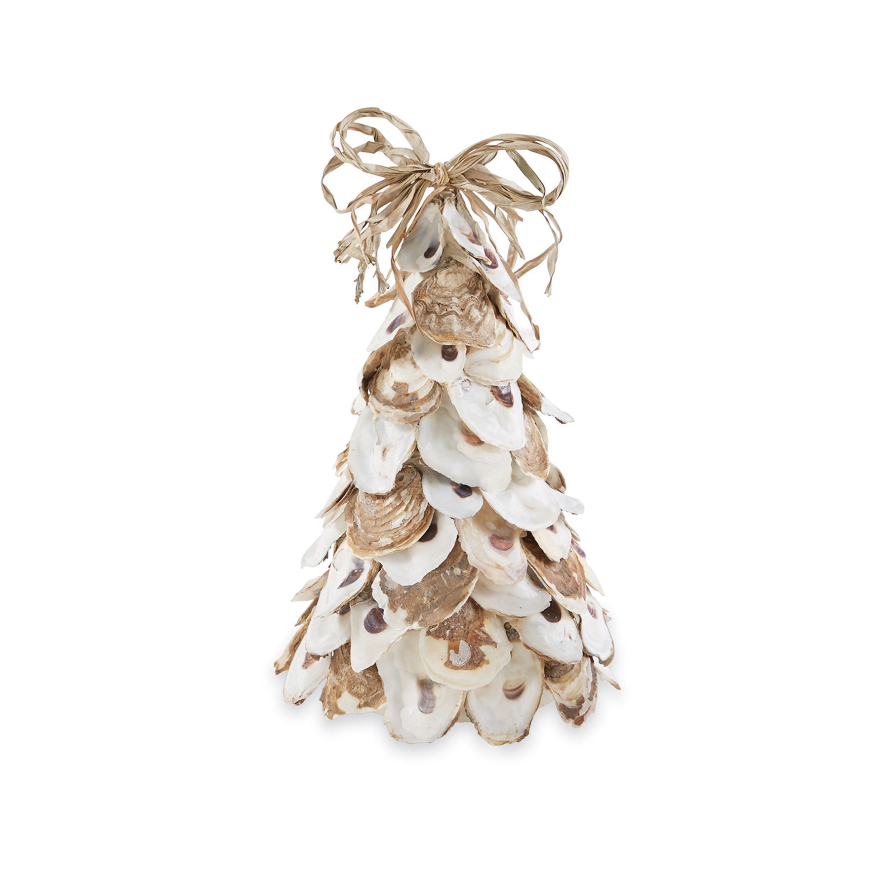 Natural large oyster shell tree sitter features raffia bow topper.