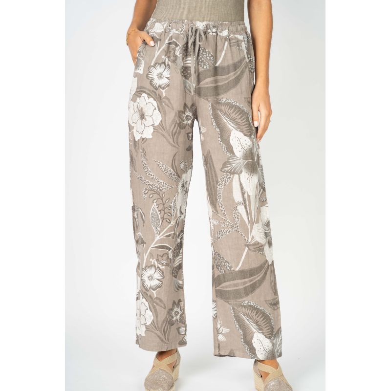 Flower Print Linen Pant. Drawstring Waist. Straight Leg.