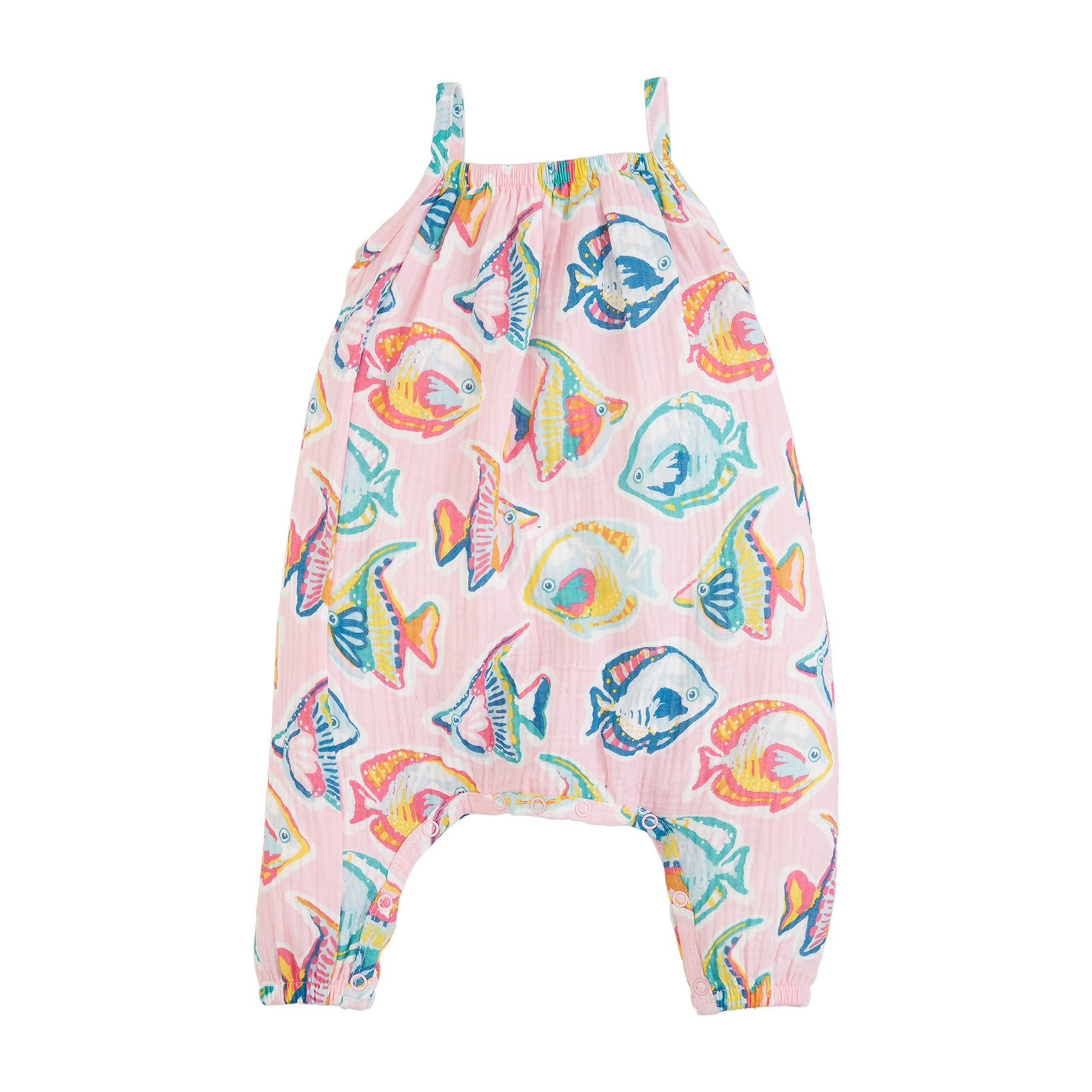 The Rainbow Fish Baby Longall is a chic and cozy choice for your little bundle of joy. Constructed from breathable and soft cotton gauze, this longall comes with inner leg snaps for effortless diaper changes. For easy washing, the longall can be turned inside out. cold water no bleach bleach. Low heat tumble dry